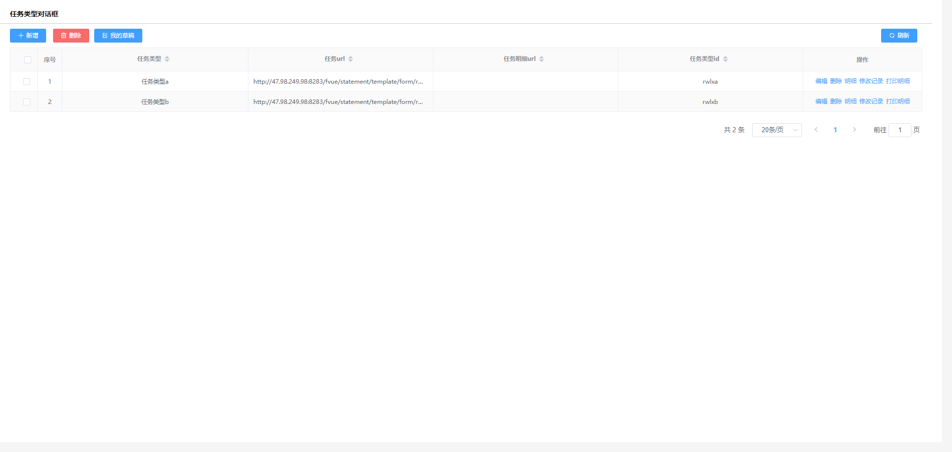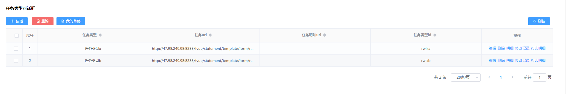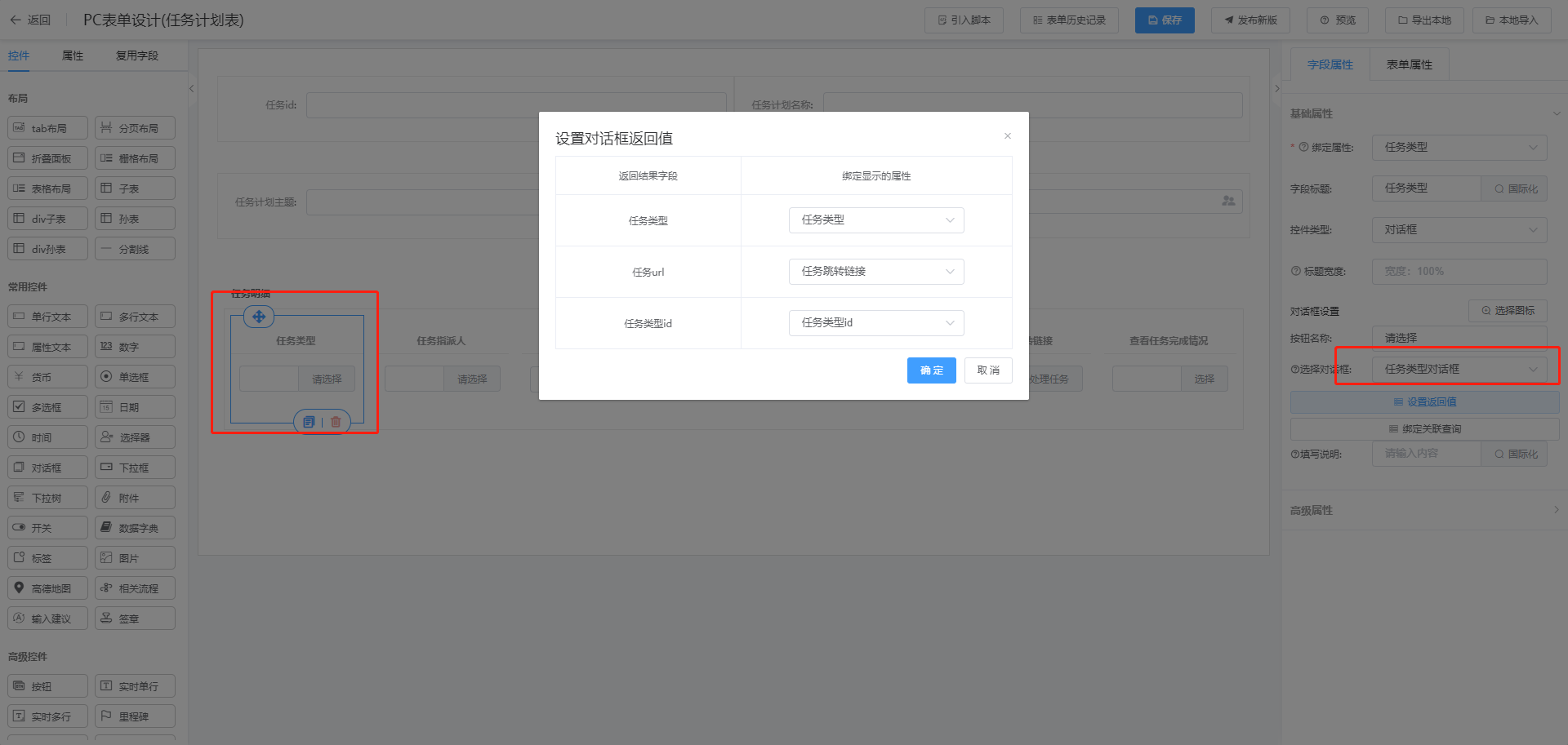 3.任务分发建模创建表单,子表一个字段绑定对话框,选择任务类型返回任务跳转链接