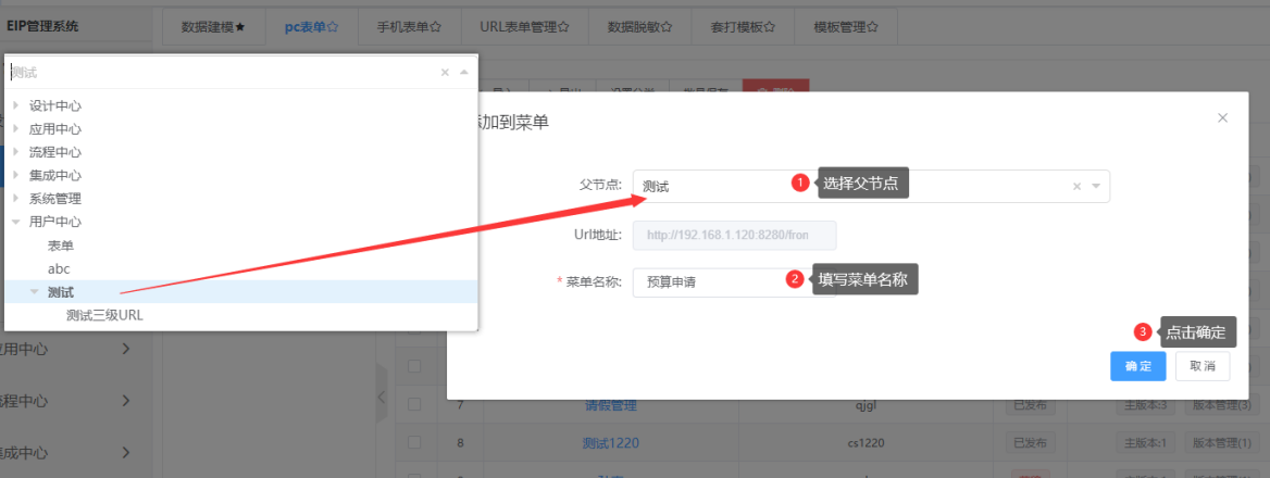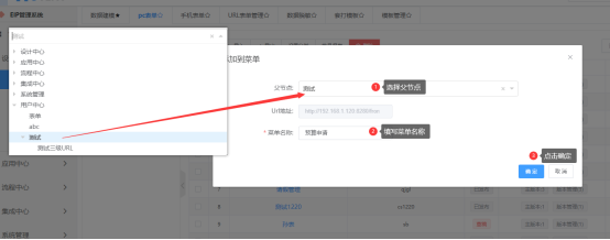 第二步:选择父节点和输入菜单名称,然后点击“确定”