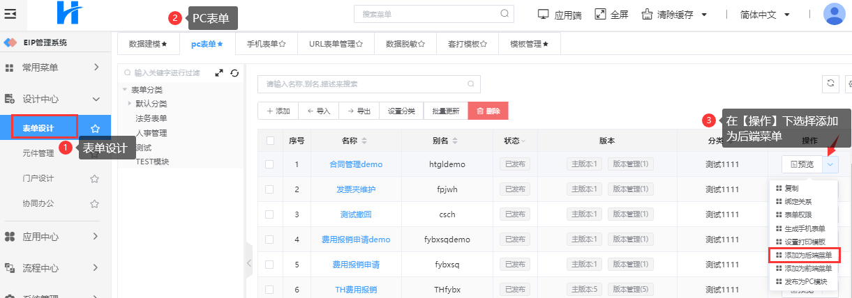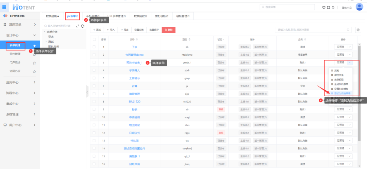 第一步:【设计中心】→【表单设计】→【PC表单】,选择表单点击“设置为后端菜单”操作