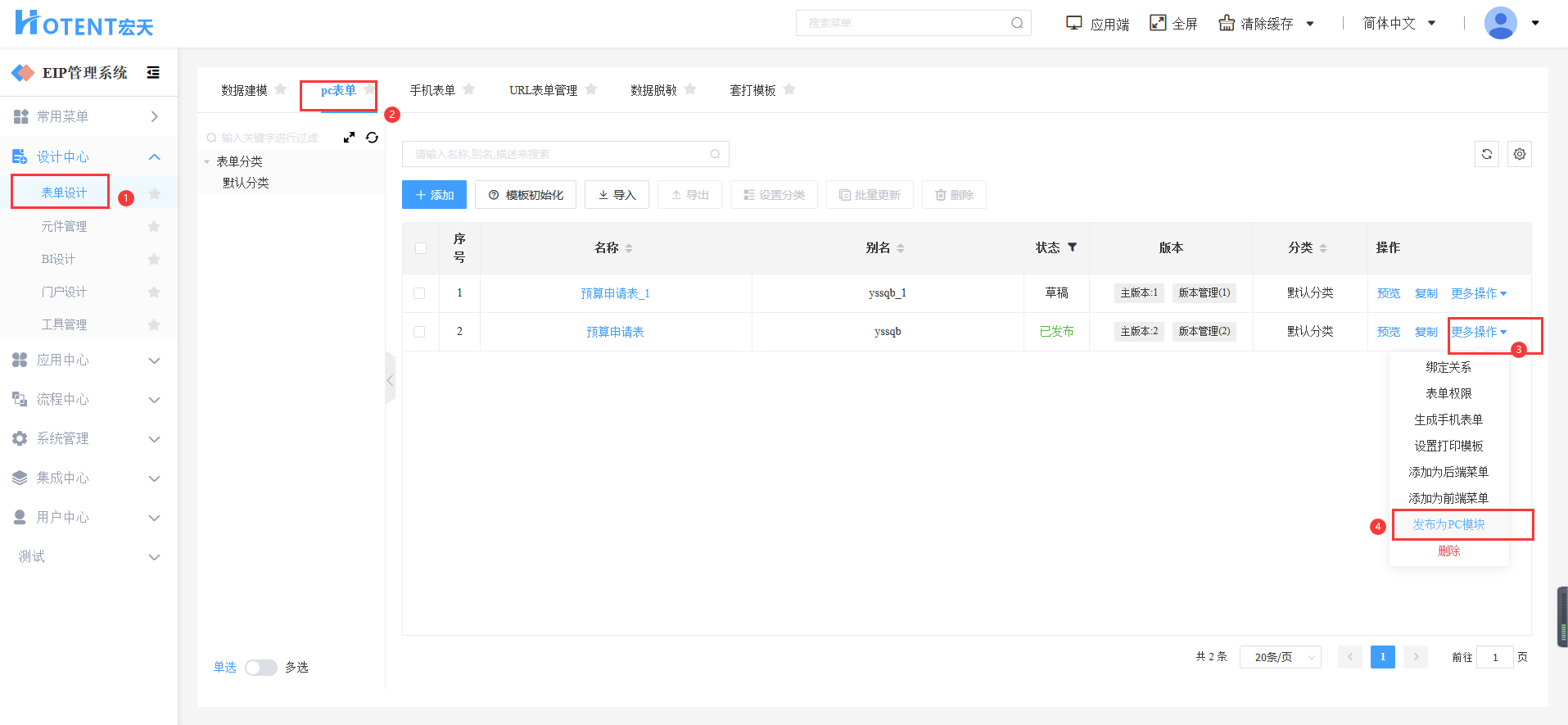 第一步:【设计中心】→【表单设计】→【PC表单】,选择表单点击“设置为pc模块”操作