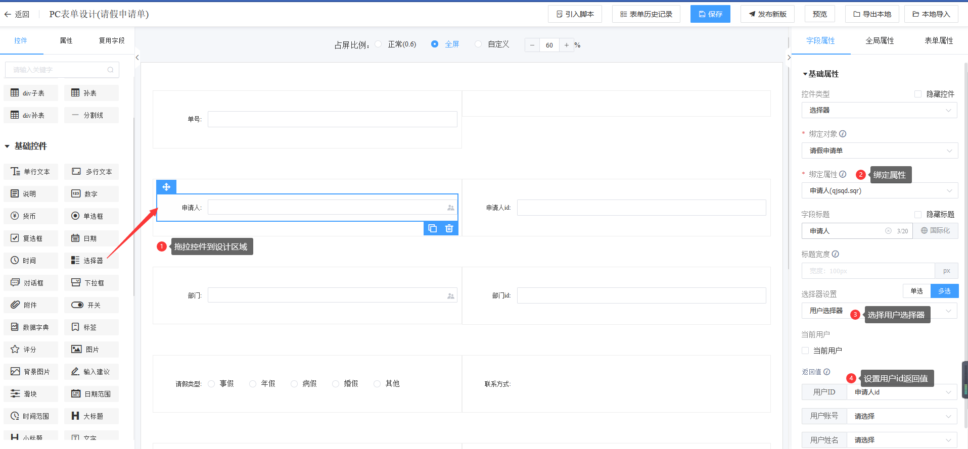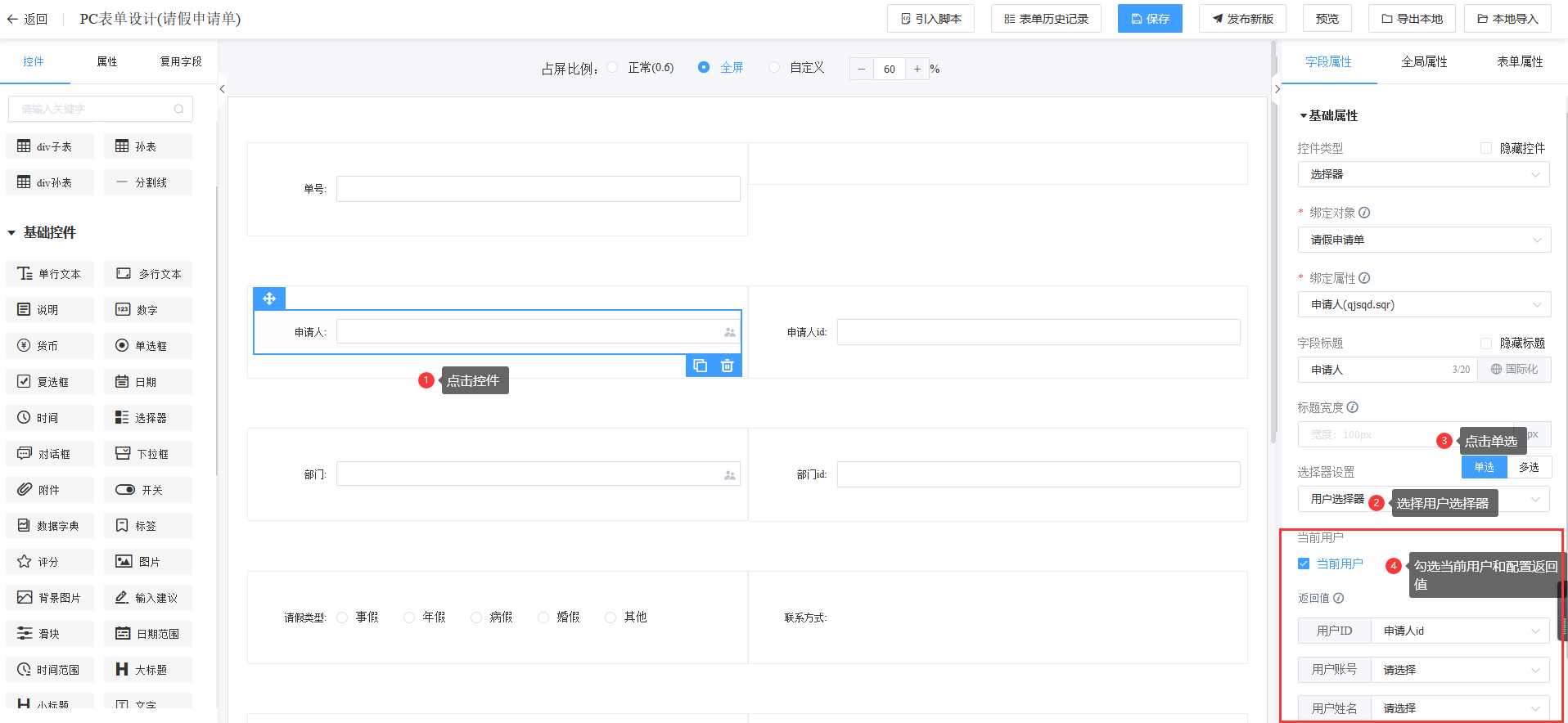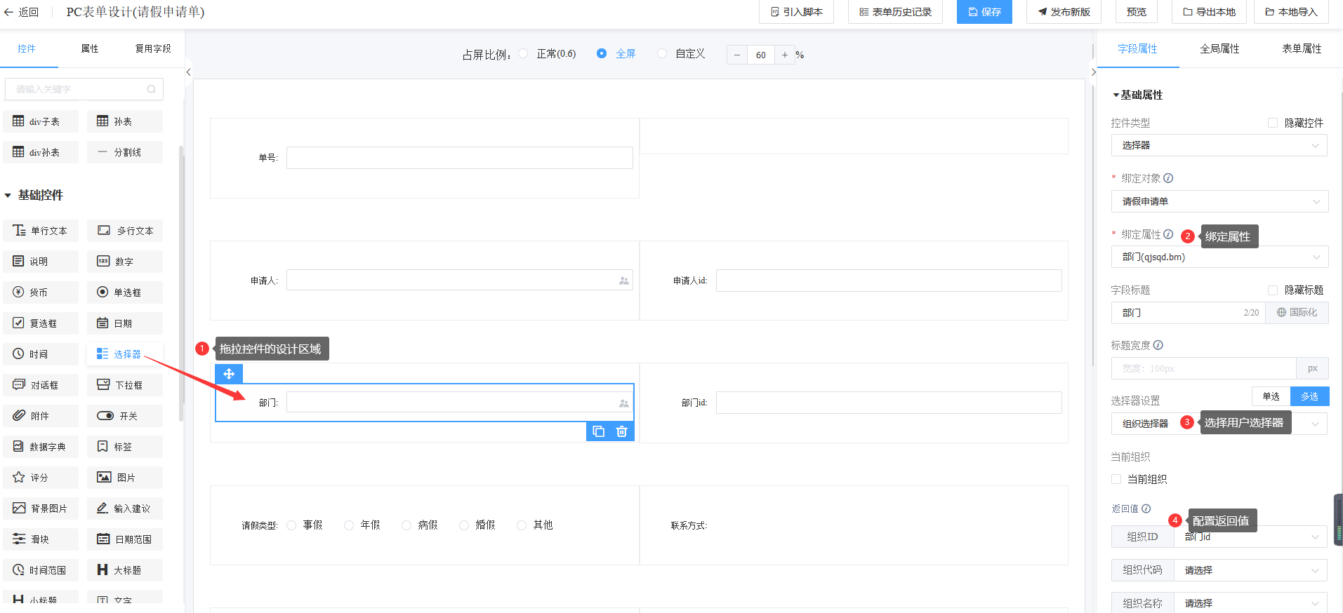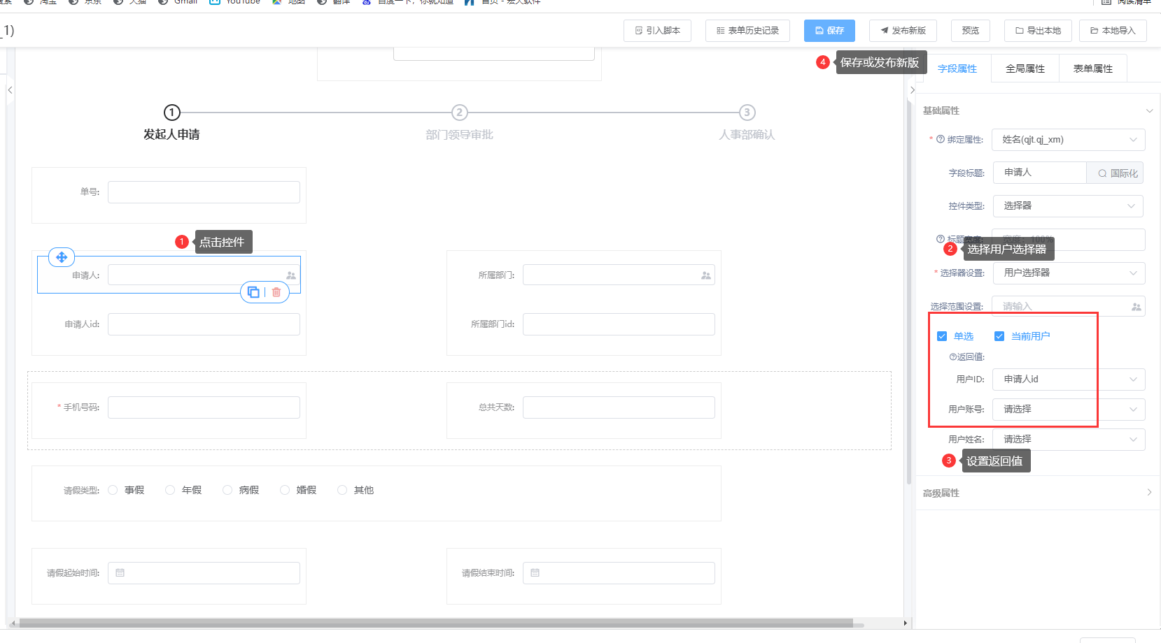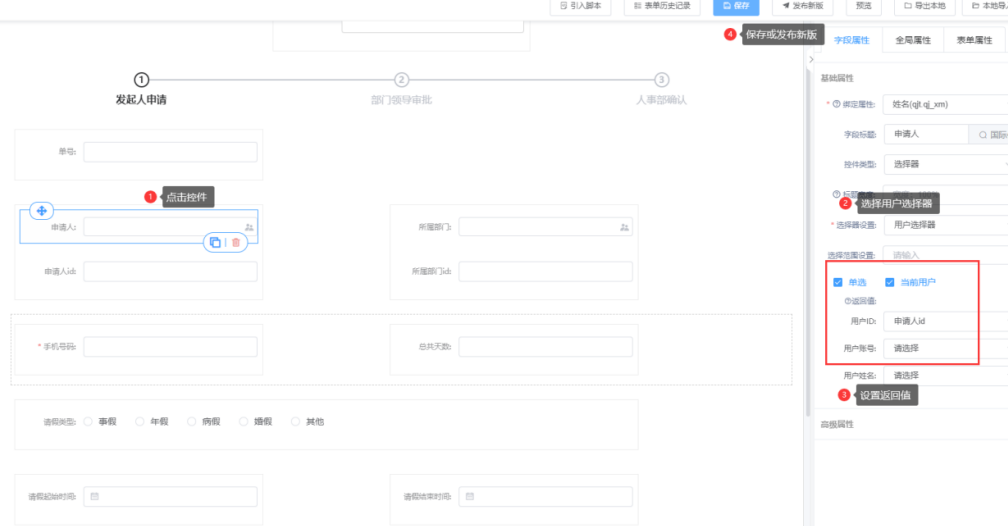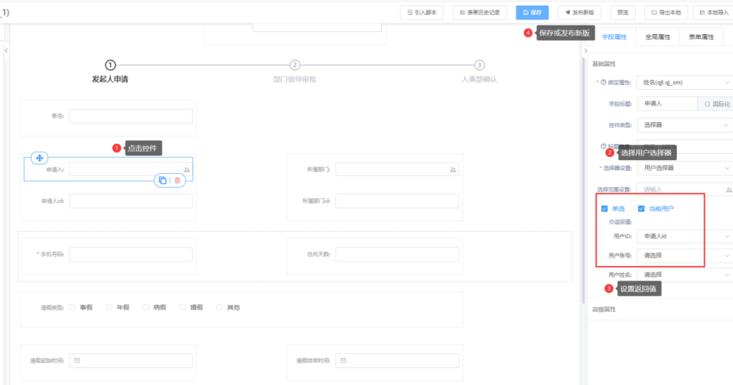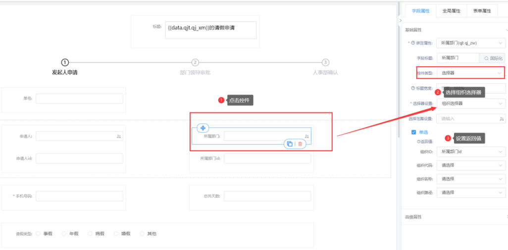 设置请假申请表单中:控件设置为“选择器”,其中申请人为用户选择器、申请人所属部门为用组织选择器,并返将用户id返回申请人id字段中、组织id返回到申请人所属部门id字段中