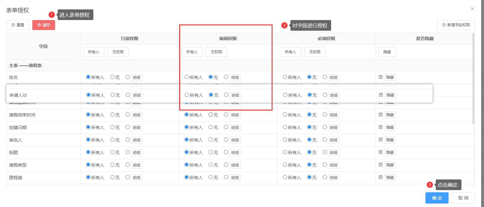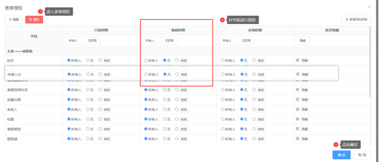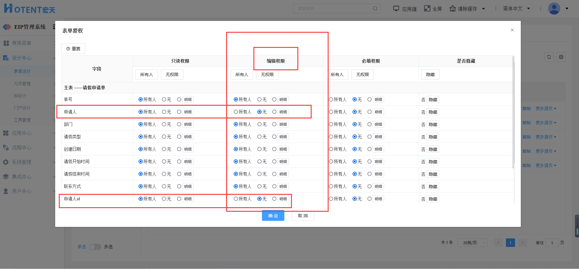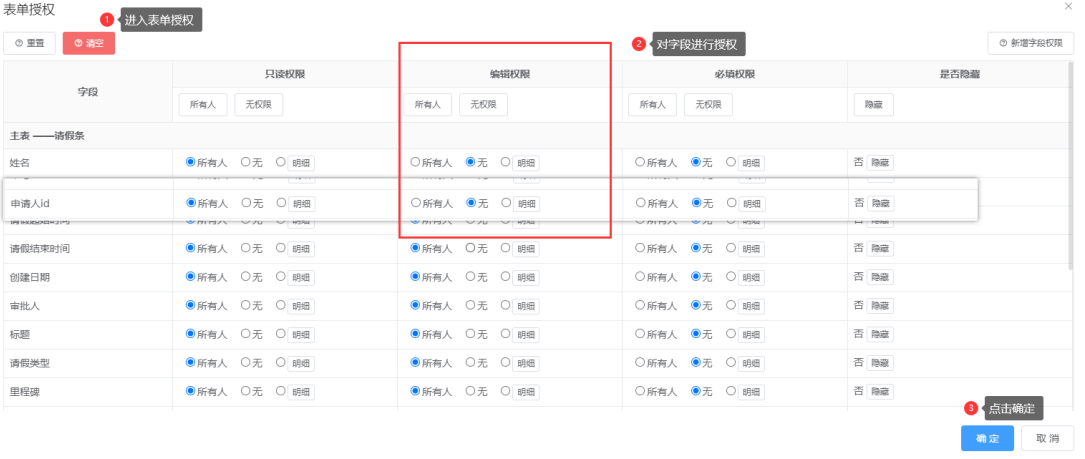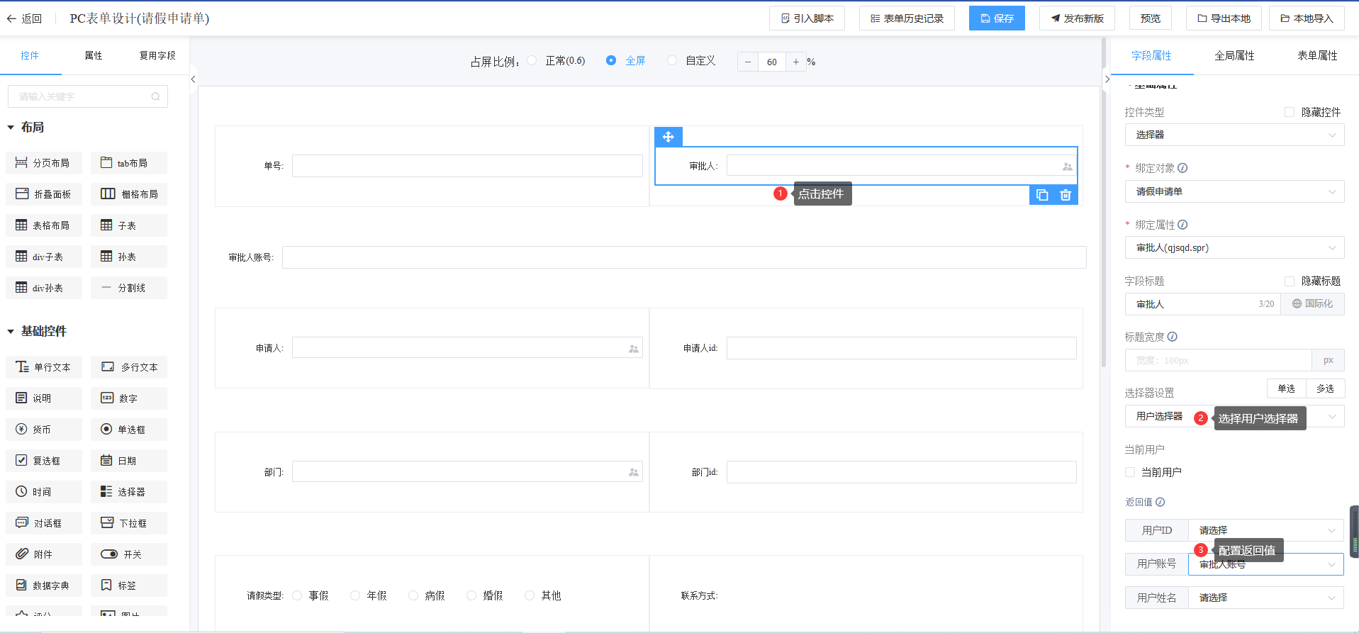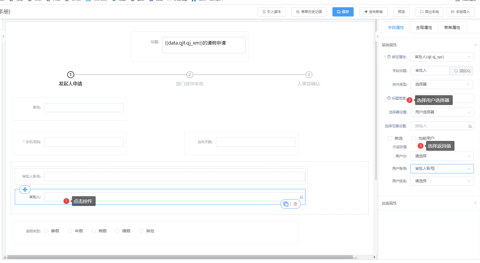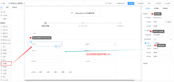 设置请假申请表单中:控件设置为“选择器”,其中申请人为用户选择器、申请人所属部门为用组织选择器,并返将用户id返回申请人id字段中、组织id返回到申请人所属部门id字段中