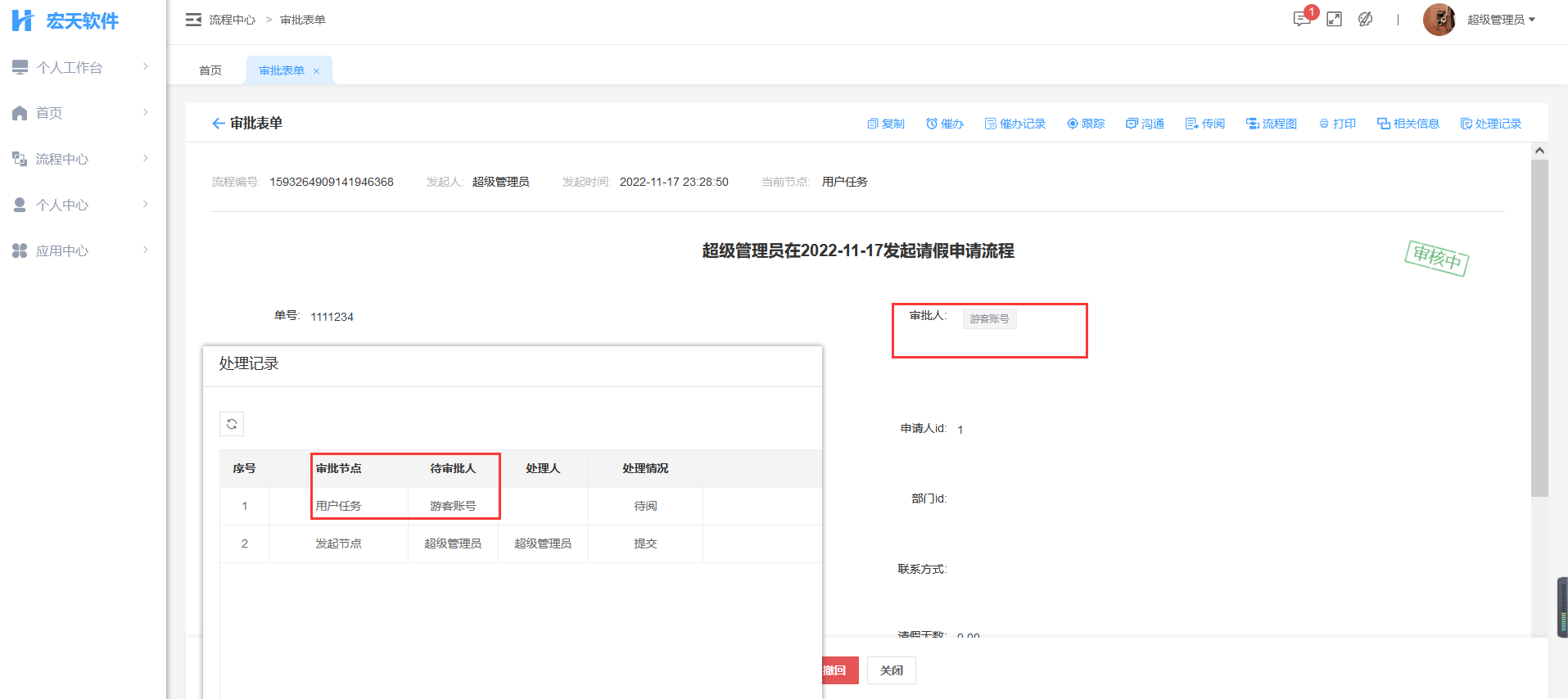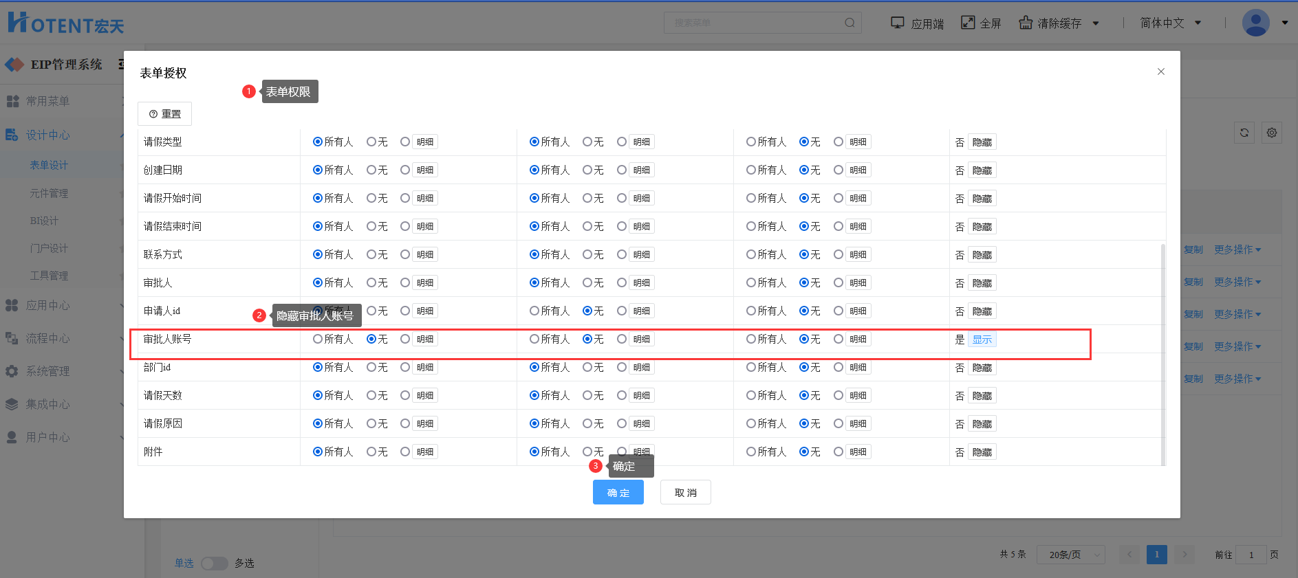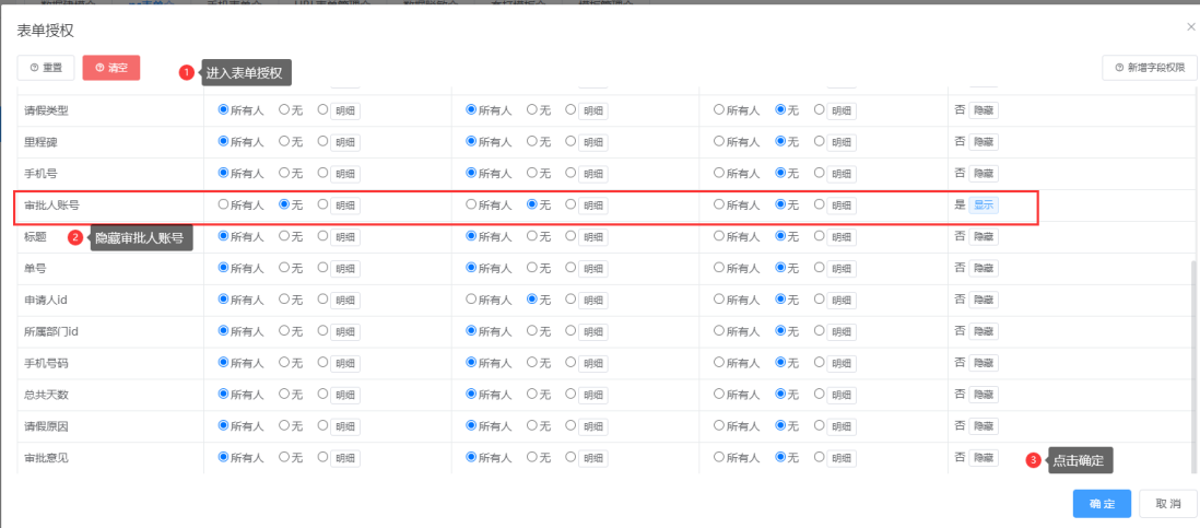 实现方案:表单中设置一个用户选择器,并将用户账号返回到表单字段“审批人账号”中,在表单权限中设置“审批人账号”字段隐藏