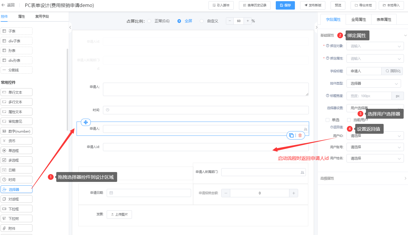 第四步:设置申请人部门字段为组织选择器,并设置返回值