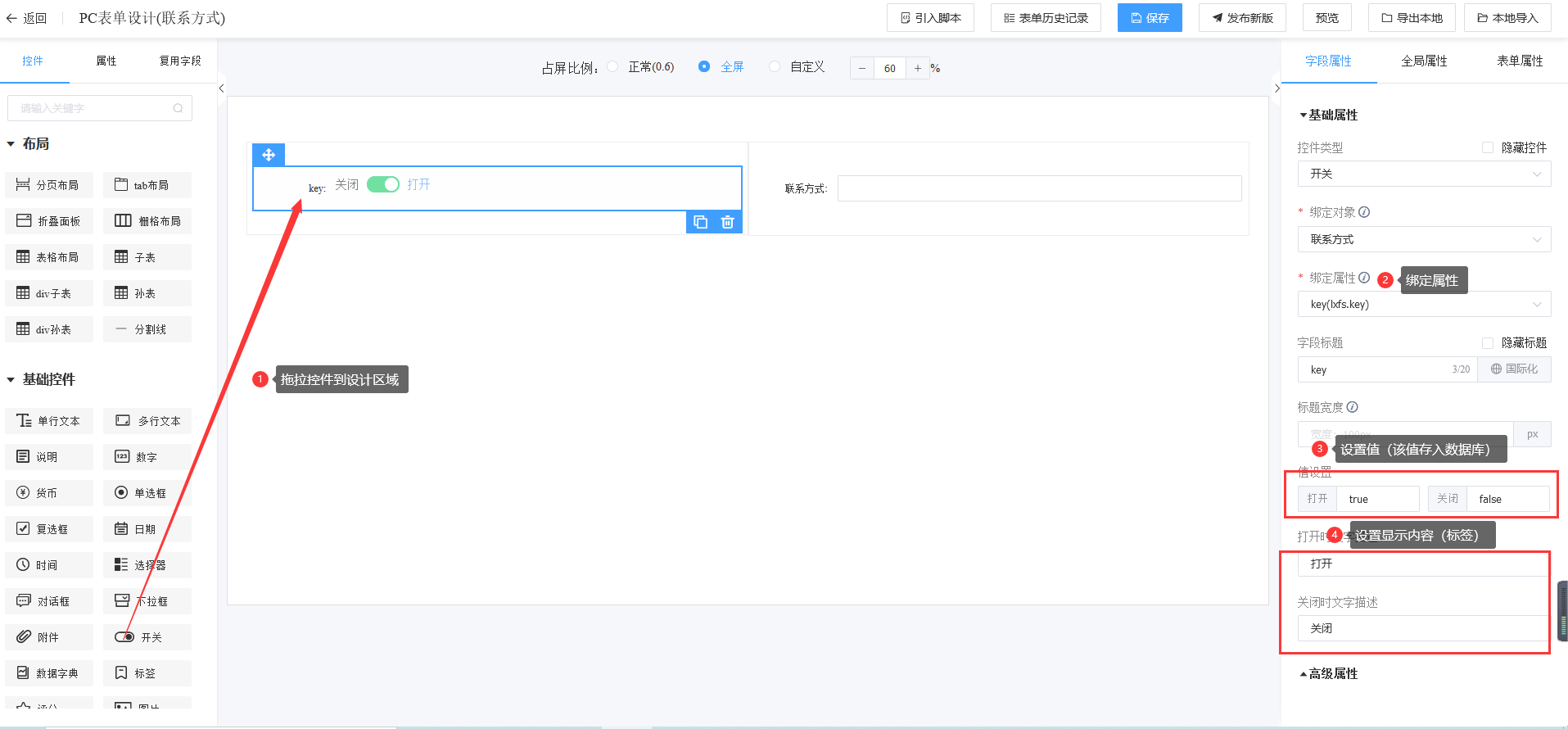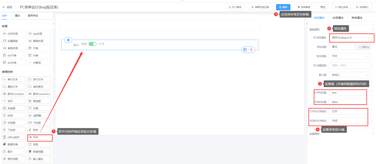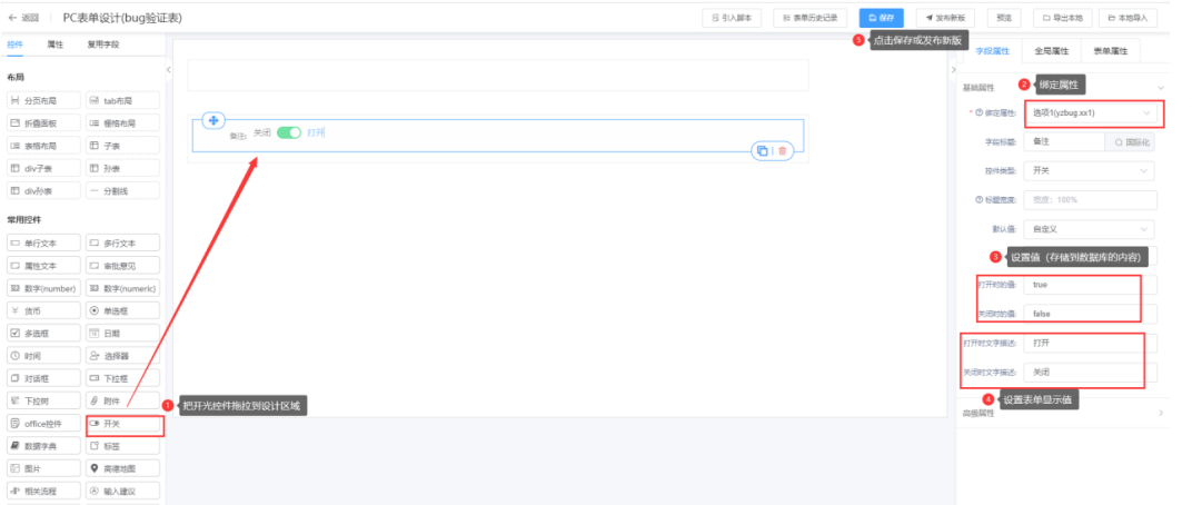 第一步:进入表单设计器页面,将开关拖拉到对应的栅格布局中;