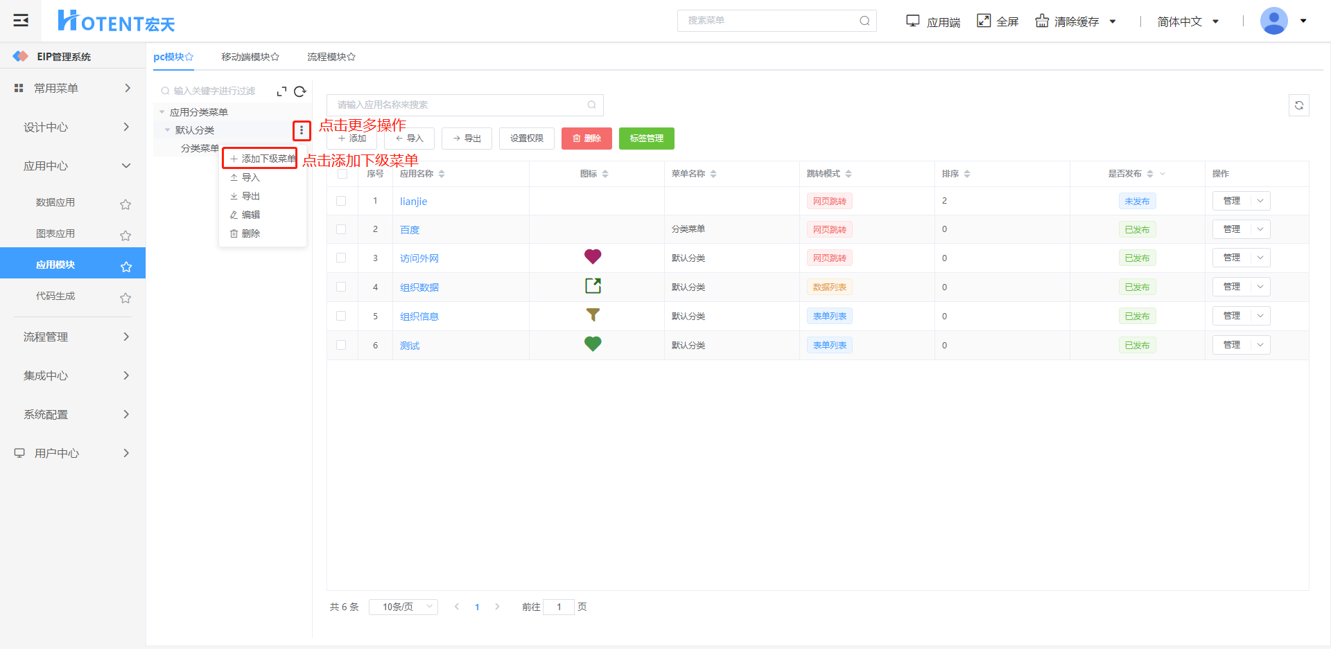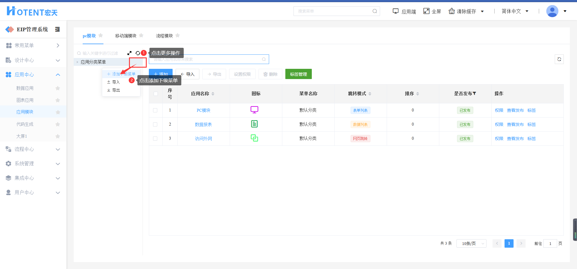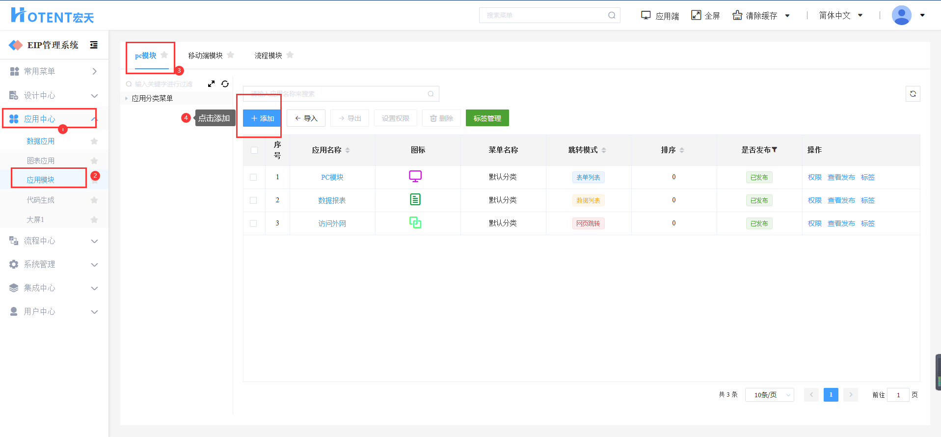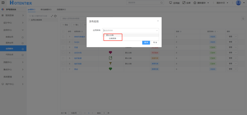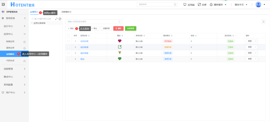 第一步:进入【应用中心】→【应用模块】→【pc模块】;