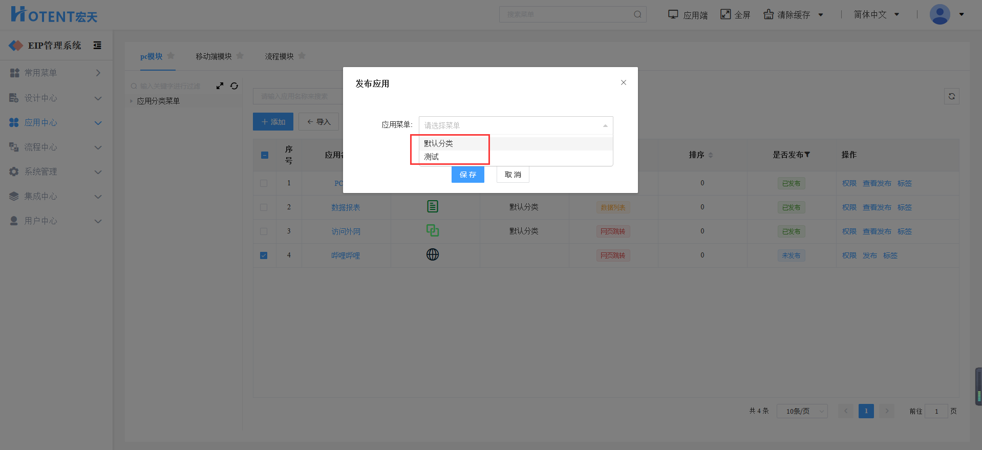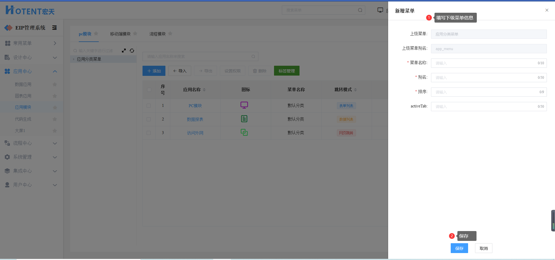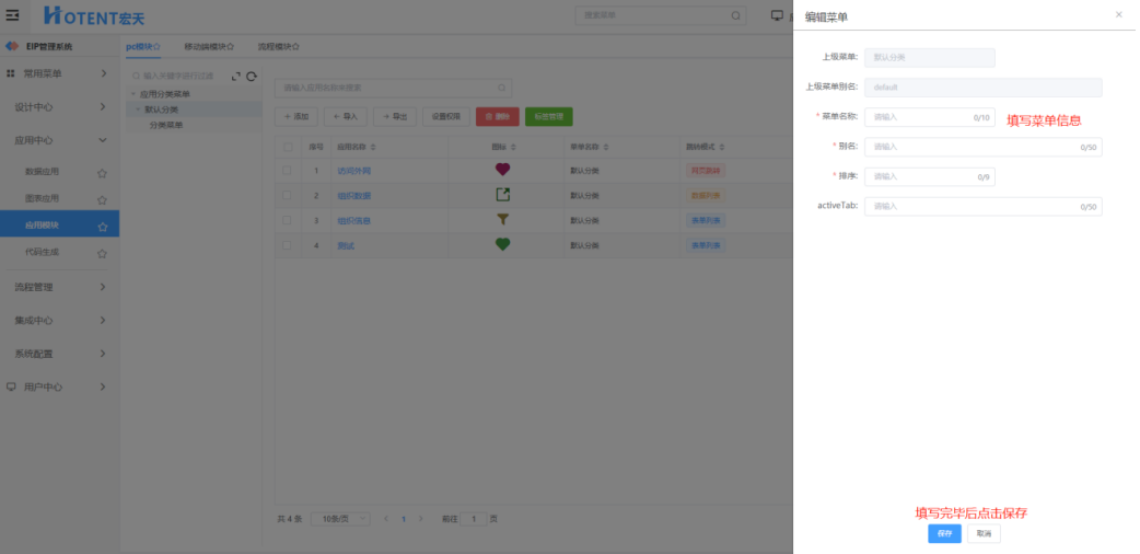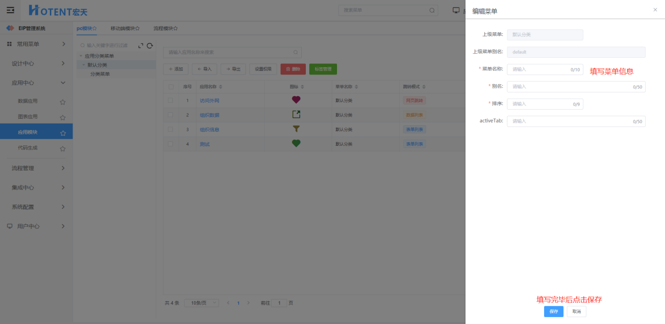 第一步:进入【应用中心】→【应用模块】→【pc模块】;