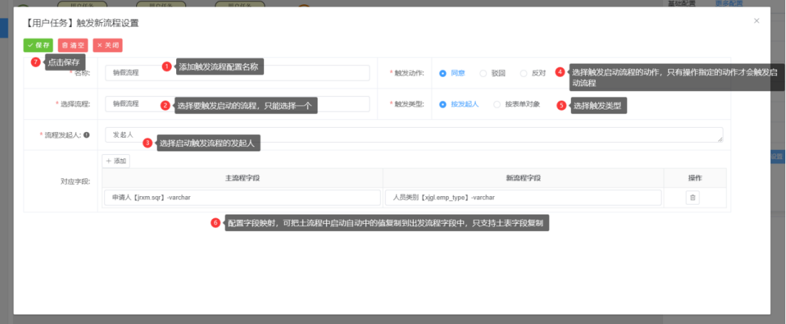 在流程审批过程中,可以通过配置触发新流程,在满足一定条件的情况下,启动新的流程,类型于外部子流程人,但又不相同,可以根据具体的场景选择不同的配置。