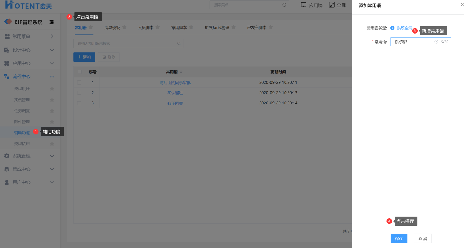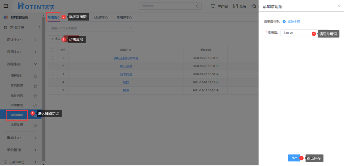 第一步:【流程中心】→【辅助功能】→【常用语】;