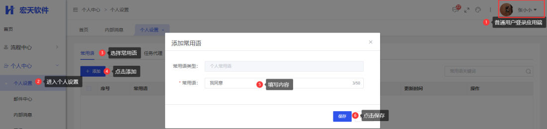 登录进入应用端:【个人设置】->【个人常用语】页面,点击“添加”按钮;
