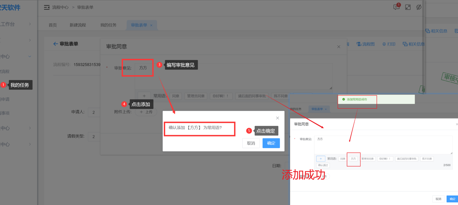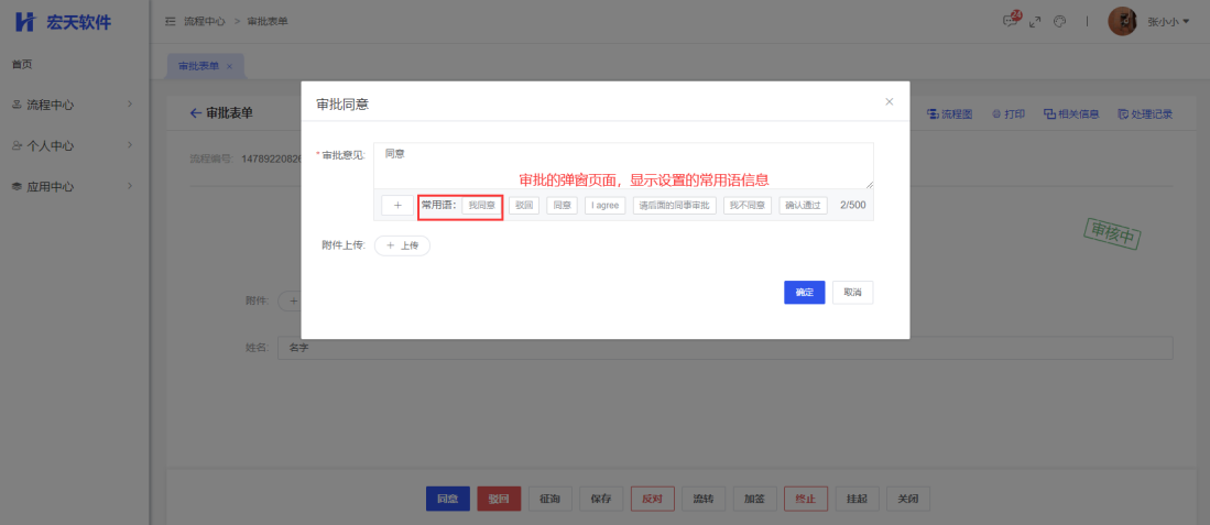 在审批流程时,即可在审批意见框下方点击常用语