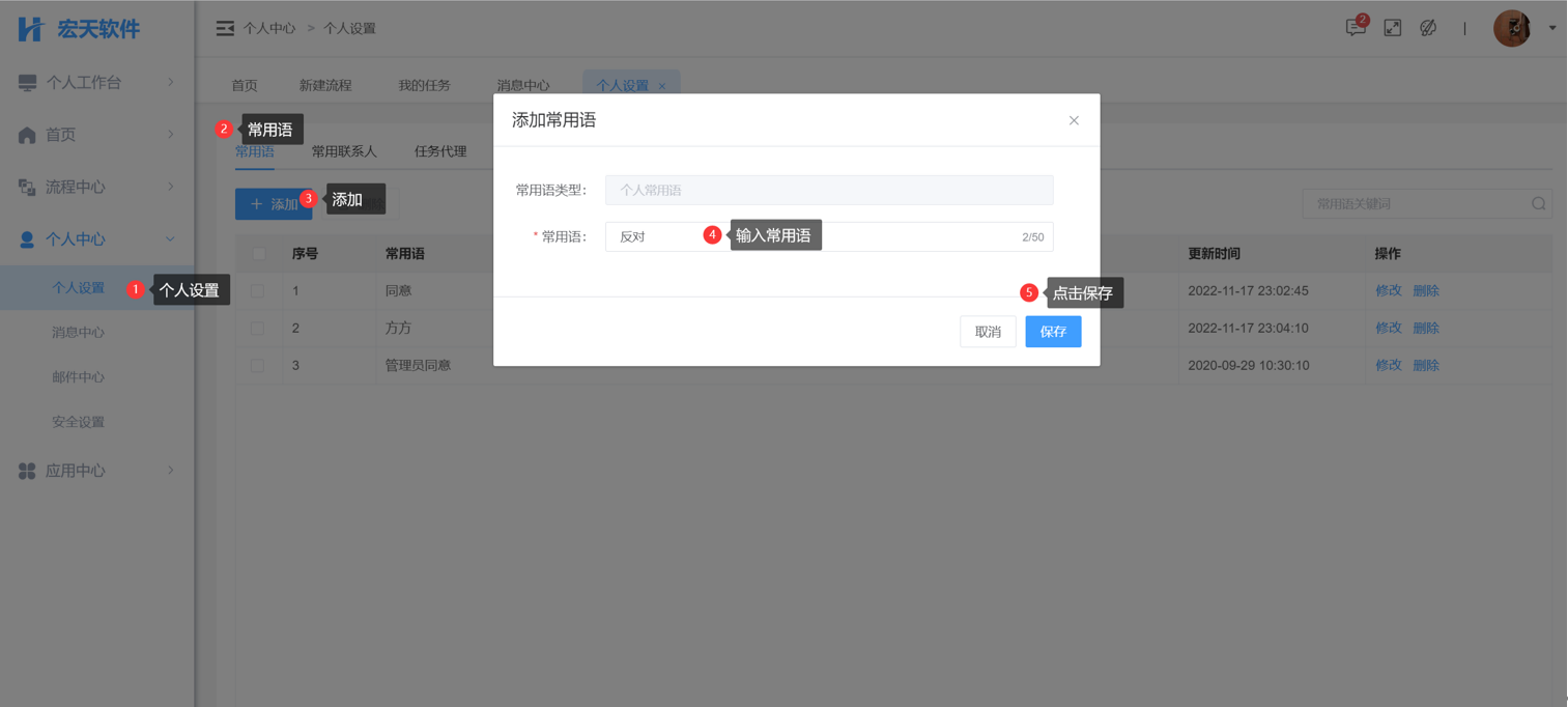 在【常用语】页面中添加流程审批时使用的审批语,这里添加的常用语系统中所有用户都可以使用。