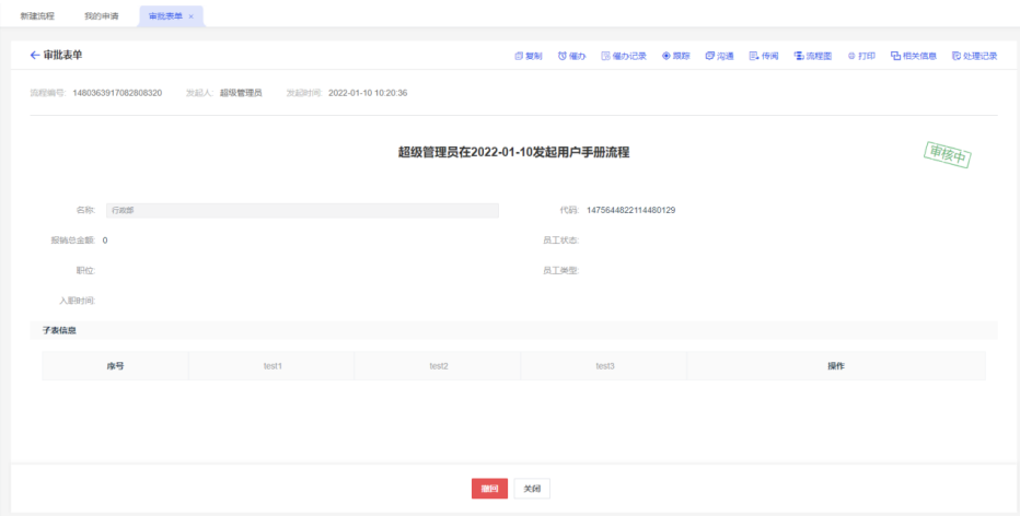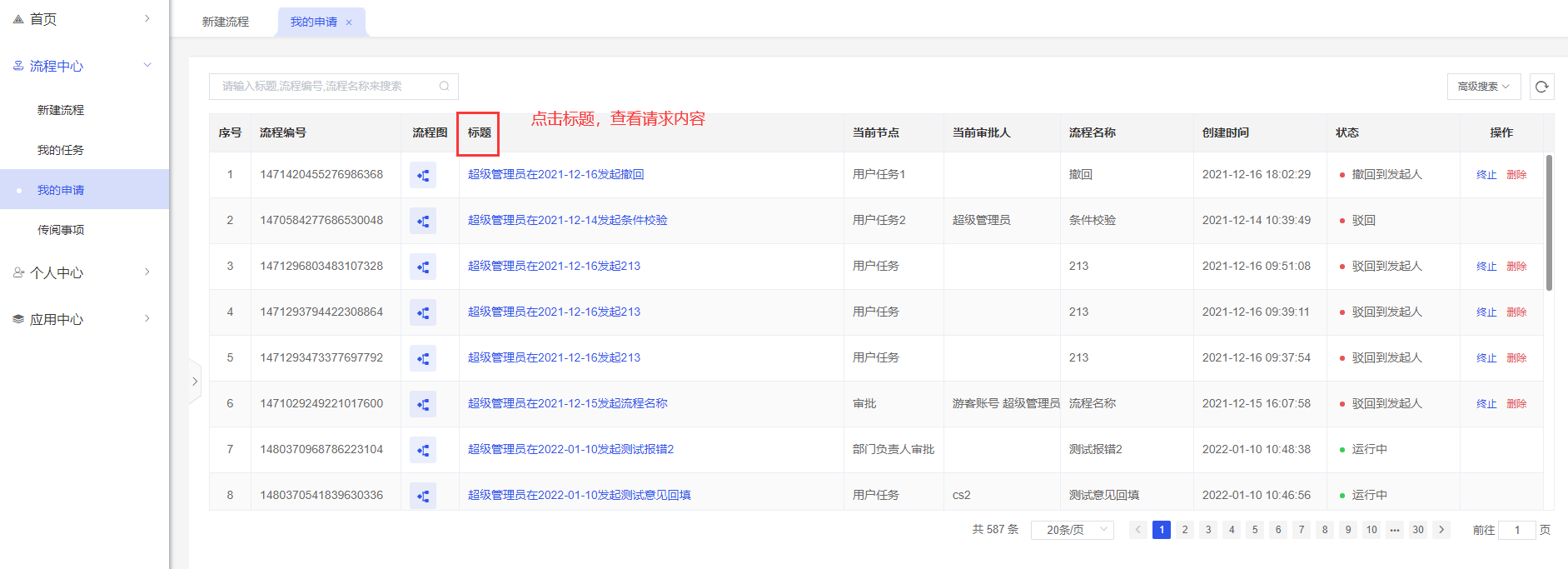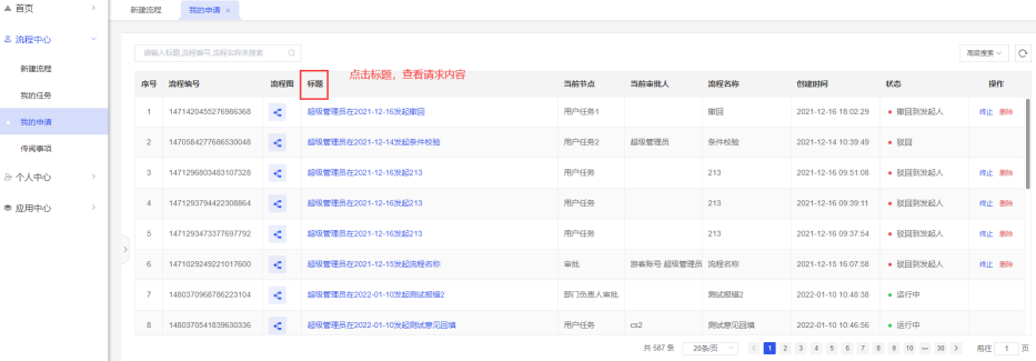 我的申请:当前用户发起过的流程,点击标题可查看流程信息;