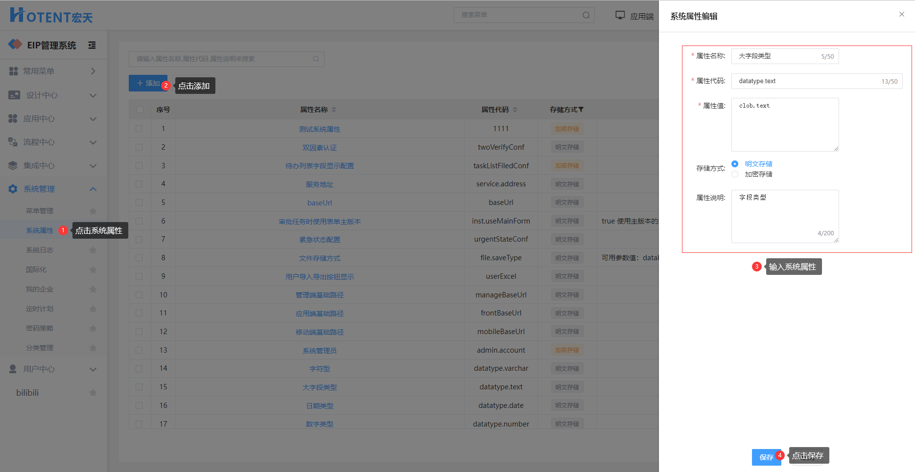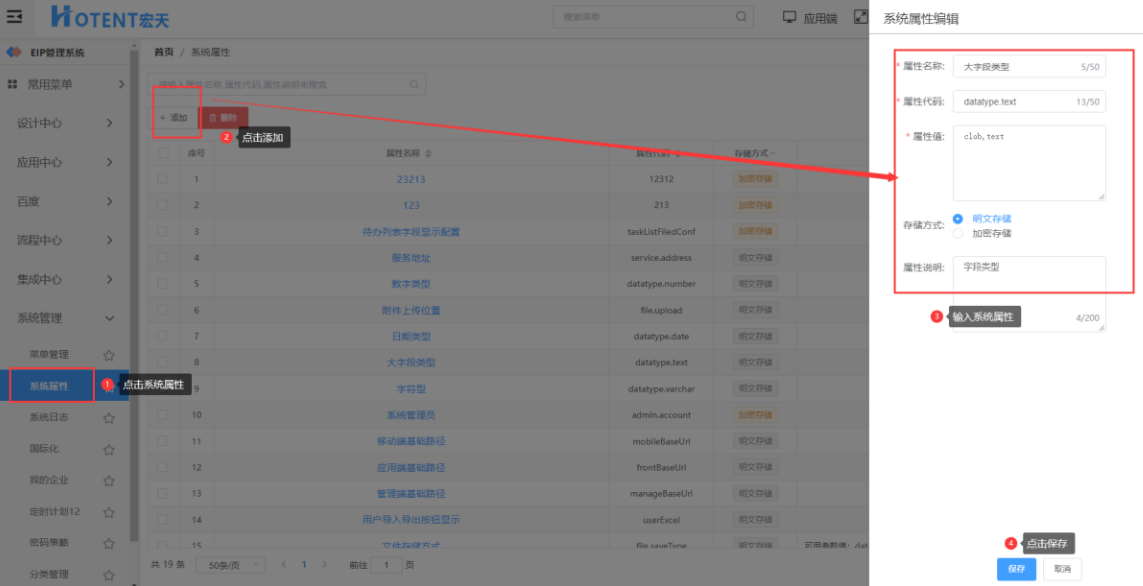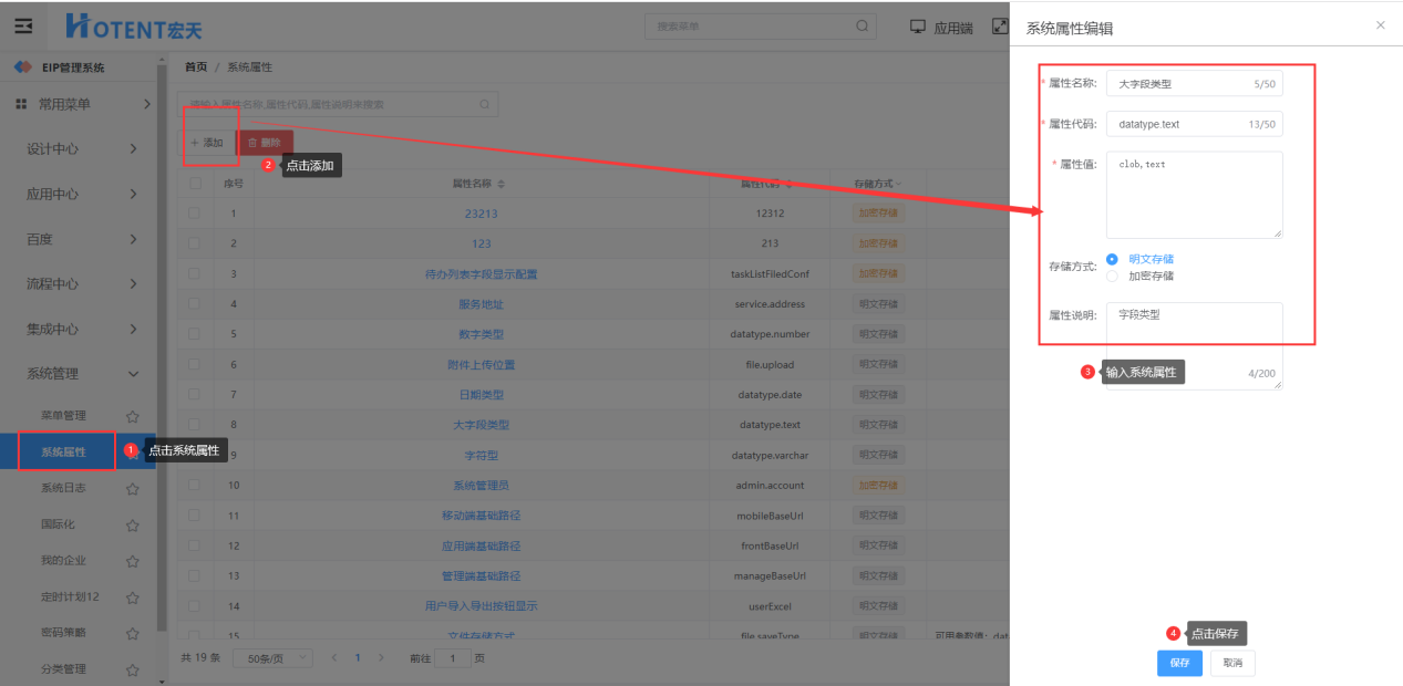 操作:【系统管理】→【系统属性】→点击“添加”→填写属性信息→点击”保存“