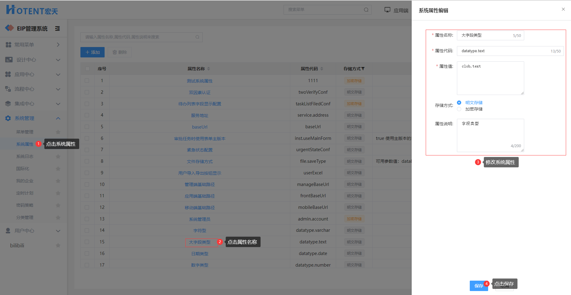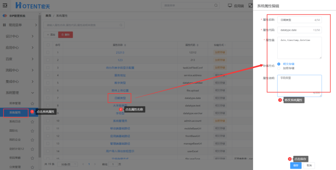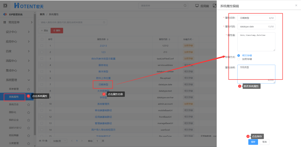 操作:【系统管理】→【系统属性】→点击属性名称,进入属性编辑页面→修改属性信息→点击“保存