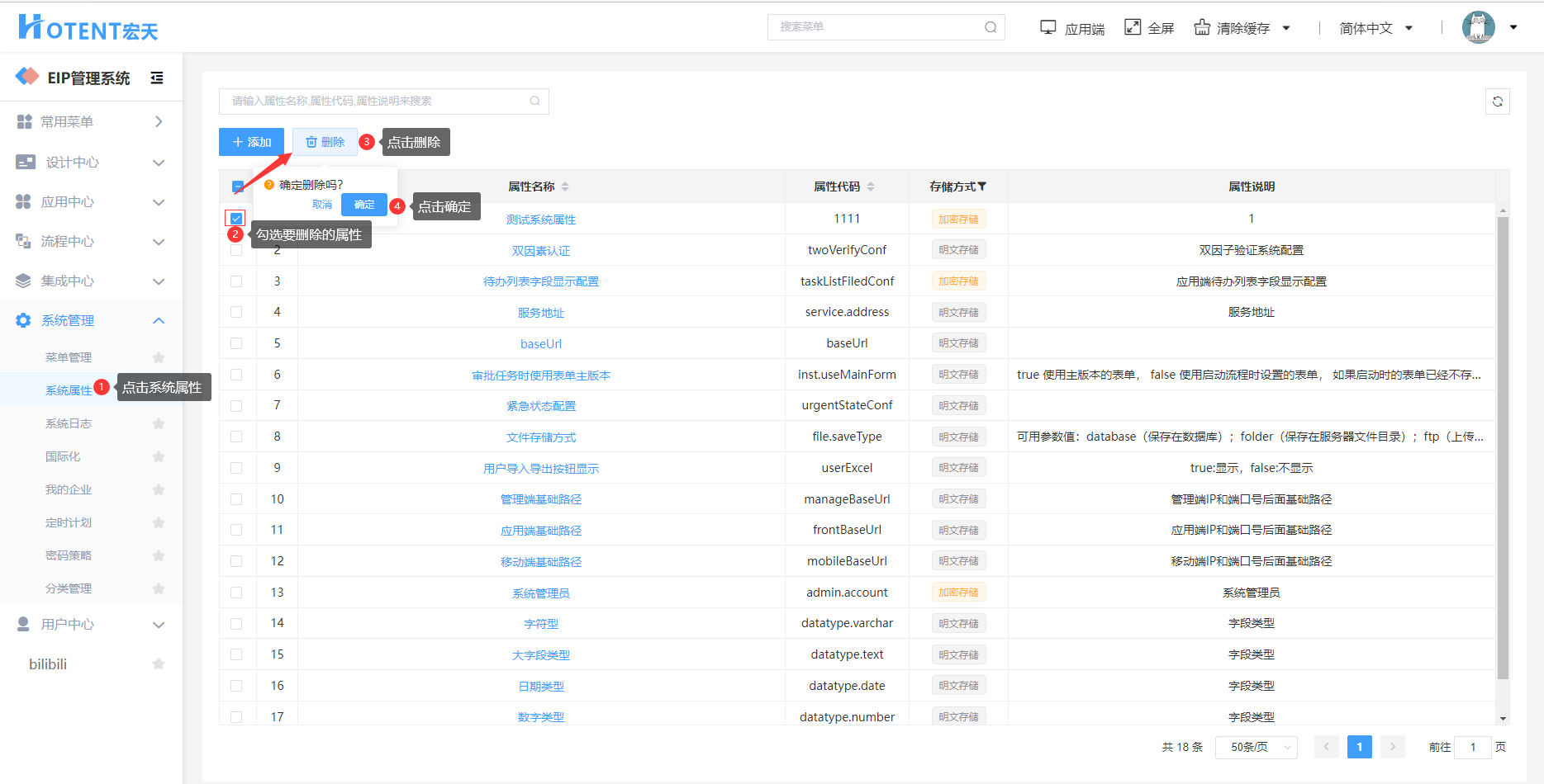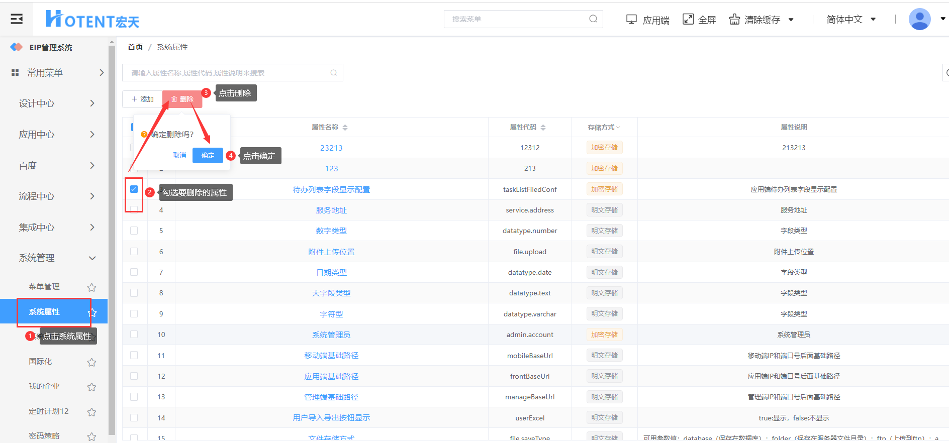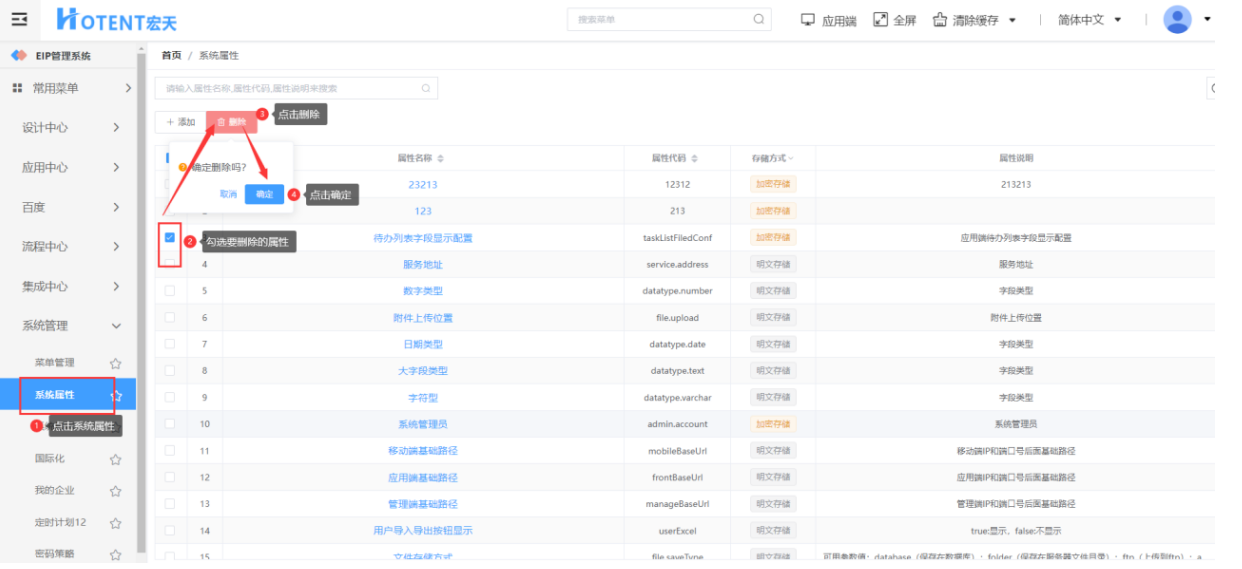 操作:【系统管理】→【系统属性】→勾选需删除的属性→点击“删除”