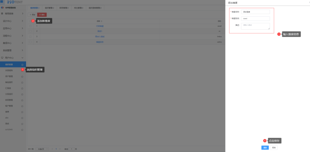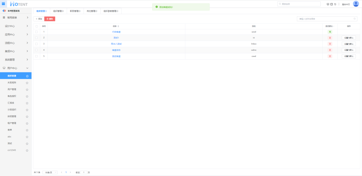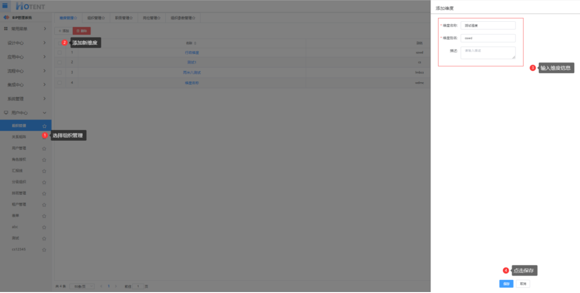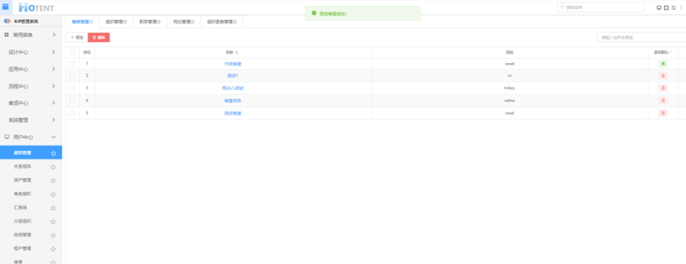 第一步:【用户中心】→【组织管理】→【维度管理】,点击添加