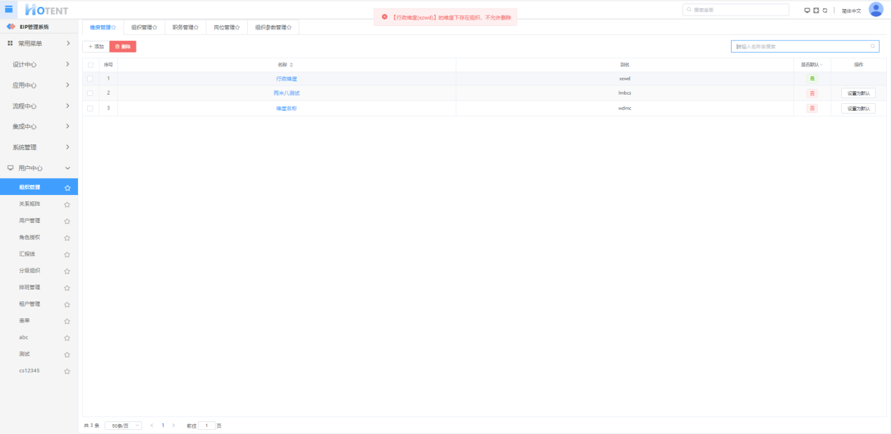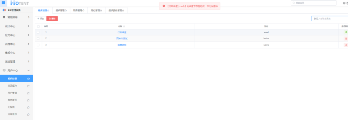注:维度下如已设置组织,不允许删除,删除提示如下: