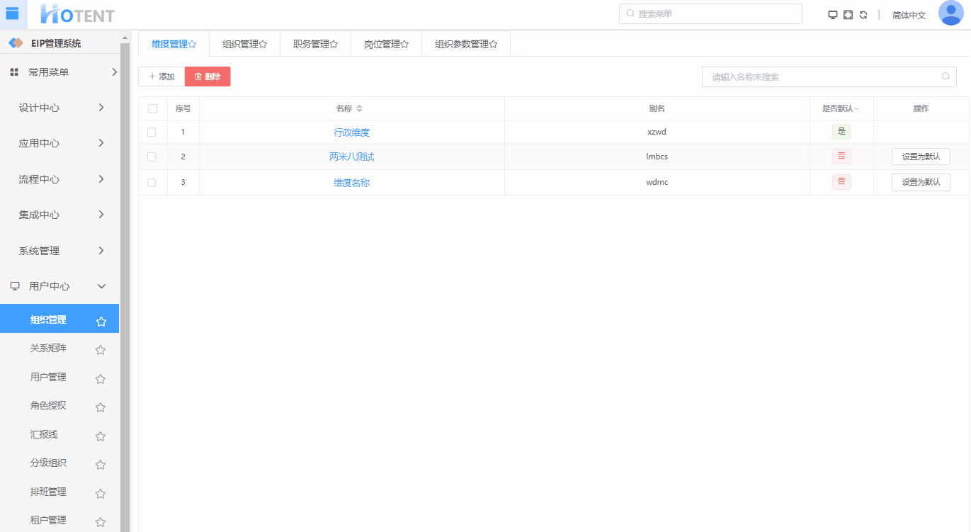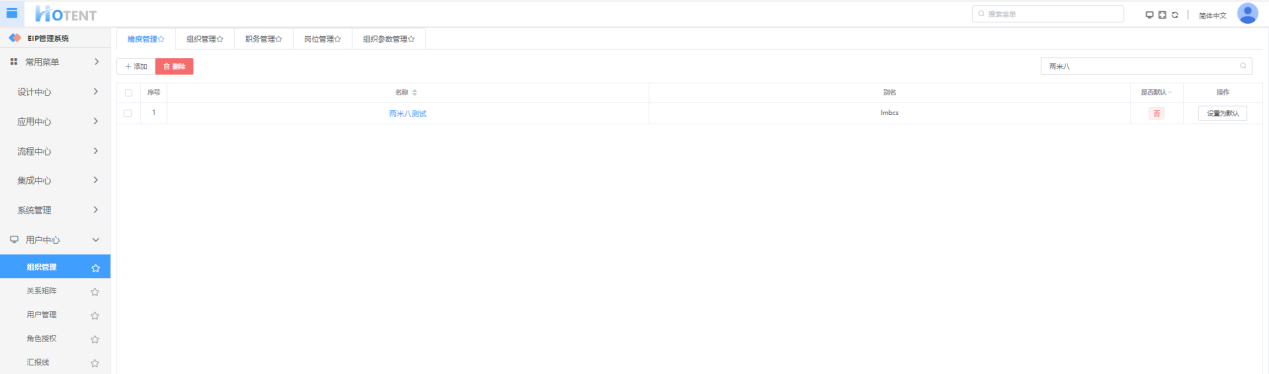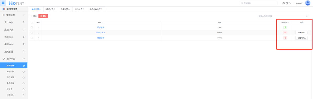 在"操作"直接设置即可。设置默认维度后,在【用户中心】→【组织管理】→【组织管理】中默认显示该维度。
