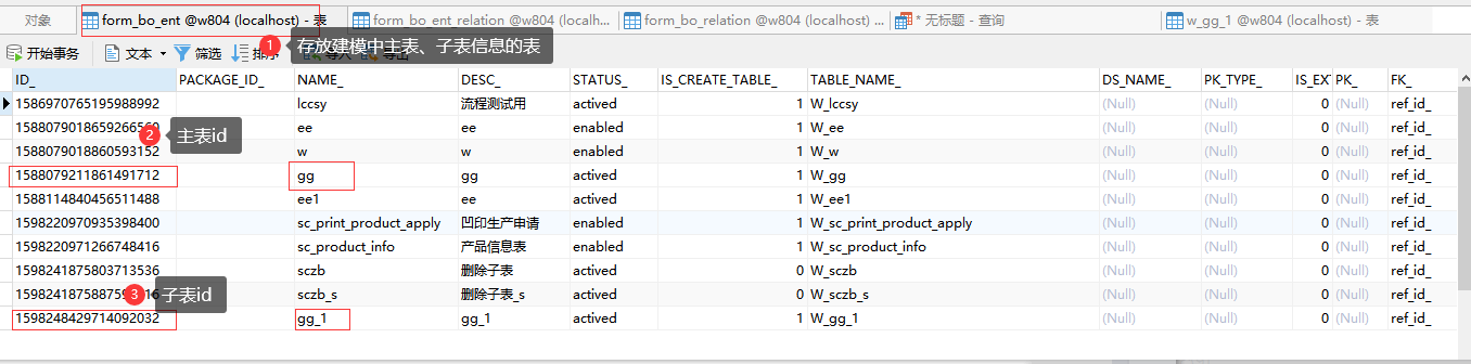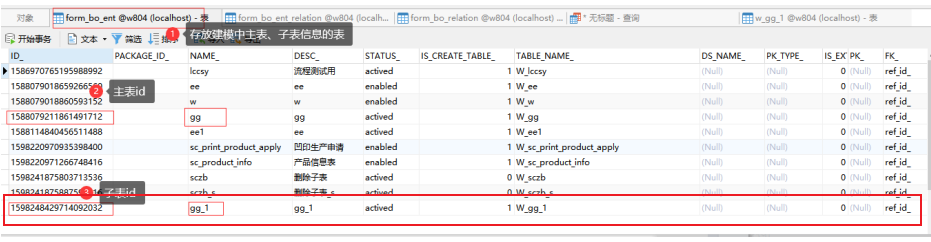 1. 先在form_bo_ent 业务实体定义表查询主表与子表的id