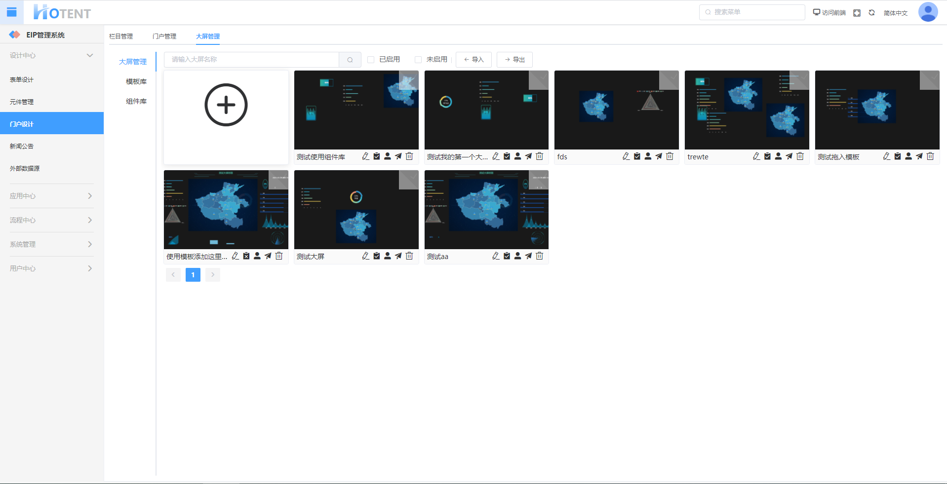 如下图所示,大屏管理入口为:设计中心/门户设计/大屏管理。